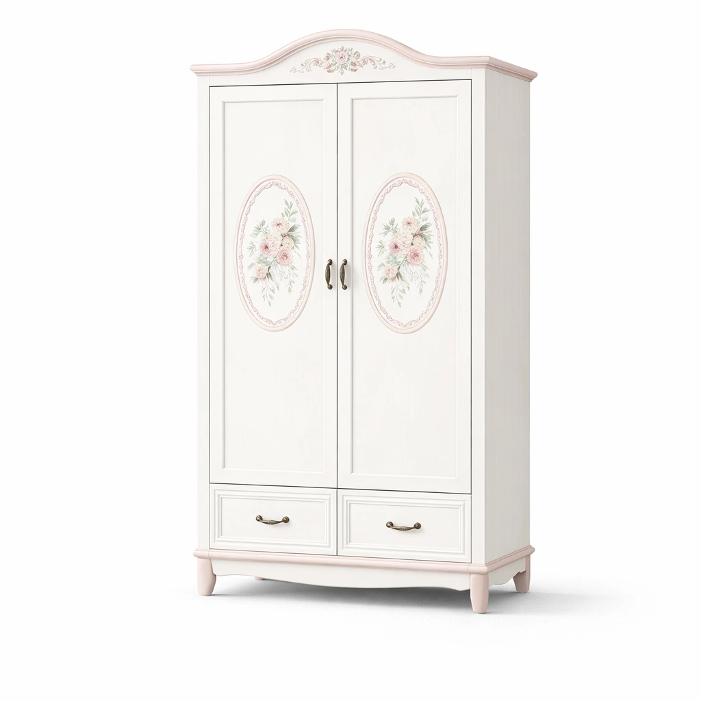 Armario de madera con diseño floral en blanco y rosa