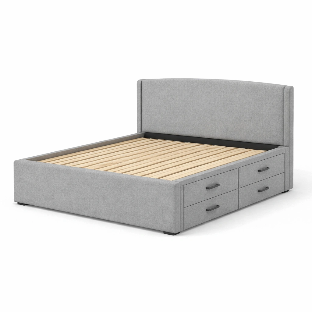 Cama con almacenamiento de madera contrachapada tapizada con cajones gris