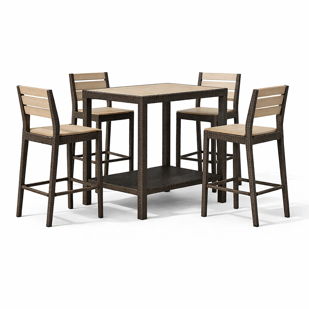 Conjunto de bar de madera y ratán con mesa alta y sillas